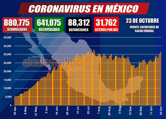 México suma en el corte de este 23 de octubre 88 mil 312 muertes por Covid-19, con 880 mil 775 casos de contagios confirmados de coronavirus, según informan autoridades de la Secretaría de Salud.