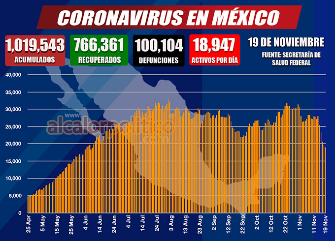 México llegó, al corte de este 19 de noviembre, a 100 mil 104 muertes por Covid-19, con un millón 19 mil casos de contagios confirmados de coronavirus, según informaron autoridades de la Secretaría de Salud.