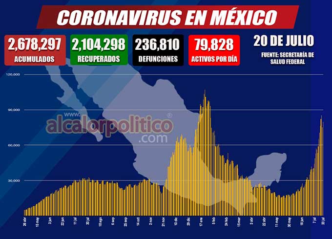 Al corte de este martes 20 de julio, México acumuló 236 mil 810 muertes por Covid-19, esto es, 341 fallecimientos más que el día anterior, informó la Secretaría de Salud.
