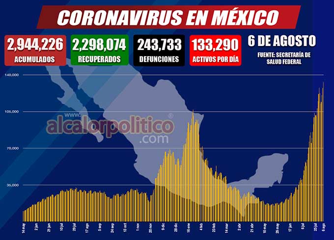 Este viernes, México acumuló 21 mil 563 nuevos contagios de COVID-19. La Secretaría de Salud reportó además 144 mil 176 casos activos estimados. Van 2 millones 944 mil 226 casos acumulados y 243 mil 733 decesos.