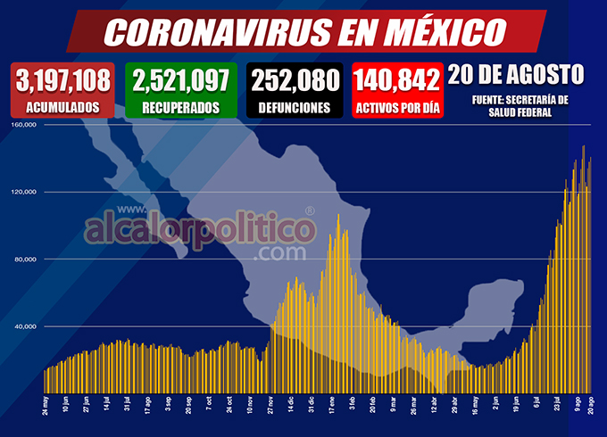 Al corte de las 17:00 horas de este jueves, México registró 21 mil 897 nuevos contagios de COVID-19, los casos activos incrementaron en 2 mil 815 pacientes y las defunciones registradas en las últimas 24 horas son en 761.