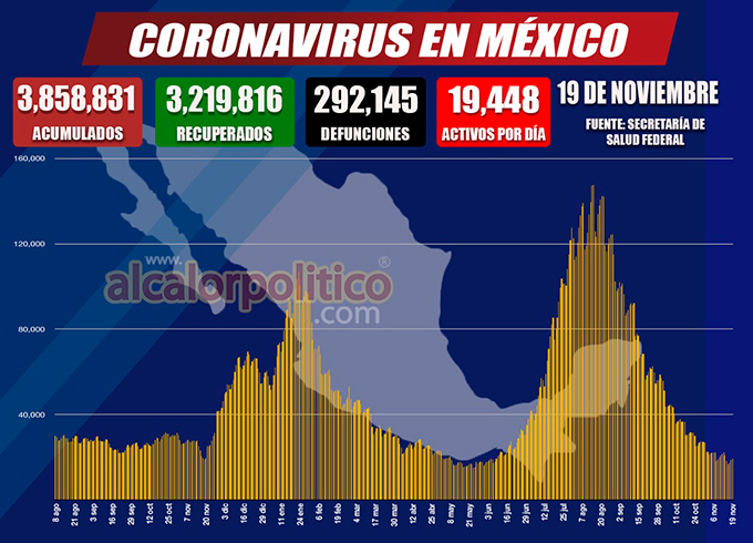 México registró este viernes 3 mil 837 nuevos contagios de COVID-19, 216 defunciones y un aumento de 685 casos activos. Se acumulan 3 millones 858 mil 831 casos y 292 mil 145 defunciones.