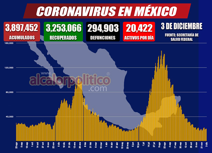 En las últimas 24 horas, México registró 3 mil 088 nuevos contagios de COVID-19, 188 defunciones y un aumento de 131 casos activos.