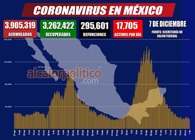 En la última jornada, La Secretaría de Salud reporta para México 3 mil 304 contagios nuevos de COVID-19, 289 defunciones y un aumento de 708 casos activos al virus.