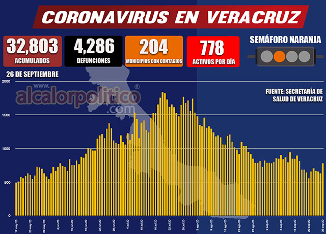 Xalapa, Ver. 26 de noviembre de 2020.- Veracruz acumula 32 mil 803 casos confirmados de COVID-19, las muertes suman 4 mil 286 y los casos confirmados ahora son 778, según la actualización de la epidemia en el Estado.