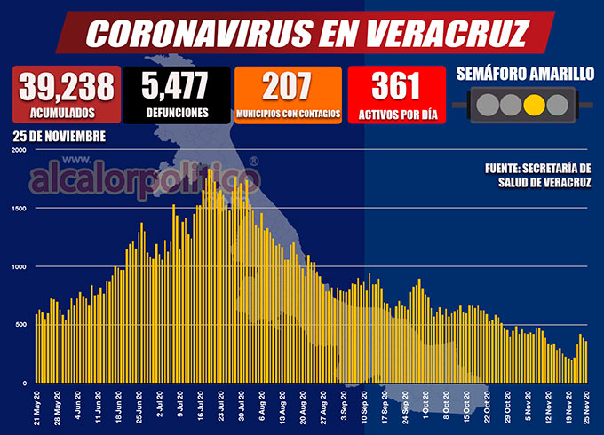 El estado de Veracruz sumó 70 muertes y 62 casos nuevos a COVID-19 en las últimas 24 horas, llegando a los 5 mil 477 fallecimientos y 39 mil 238 contagios acumulados desde el inicio de la pandemia.