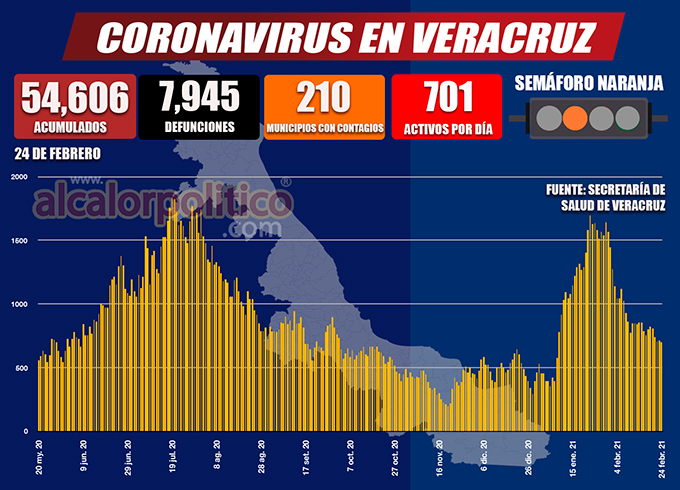 El Estado de Veracruz está cada vez más cerca de las 8 mil muertes por COVID-19, al acumular hasta este miércoles 7 mil 945 fallecimientos en 195 municipios, 25 de los cuales ocurrieron en las últimas 24 horas.
