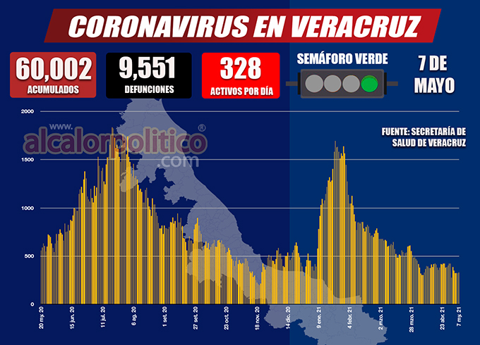 El Estado de Veracruz superó este viernes la barrera de los 60 mil casos acumulados de COVID-19, al registrar 42 nuevas infecciones en las últimas 24 horas y con ello situarse en 60 mil 2 contagios.