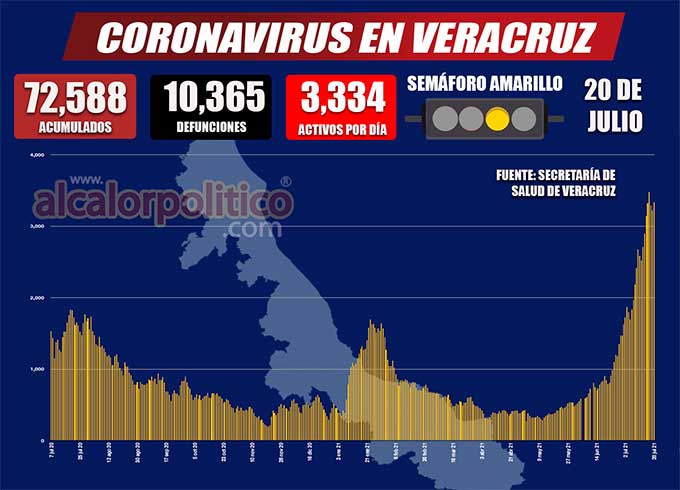 La jefa de Epidemiología de la Secretaría de Salud, Dulce María Espejo Guevara, informó que actualmente 3 mil 334 veracruzanos tienen activa su enfermedad de COVID-19; entre tanto, los contagios acumulados se ubican en 72 mil 588.