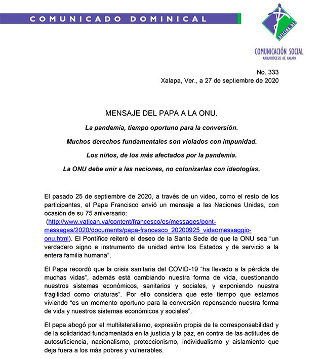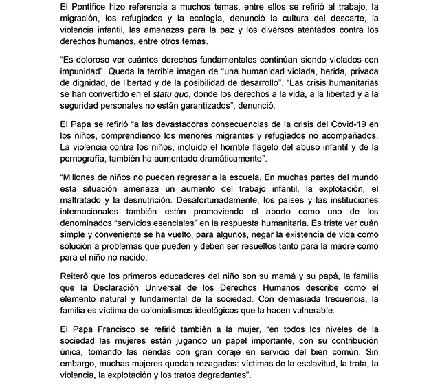 COVID-19 está cambiando nuestra forma de vida, expone nuestra fragilidad dice Papa ante ONU