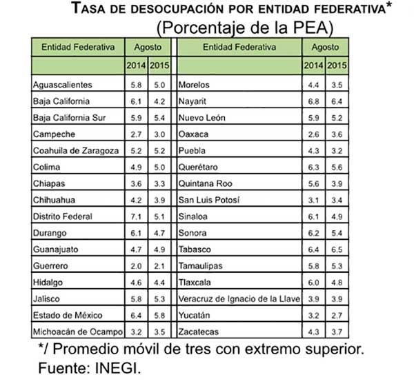 El INEGI apunta que con base en cifras desestacionalizadas, la Tasa de Desocupación (TD) en el ámbito urbano no presentó variación en agosto respecto a la de julio de 2015 (5.1%).