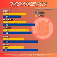 Dato relevante también es que durante mayo, los municipios de Veracruz y Xalapa fueron los que registraron el mayor número de denuncias por violación sexual simple con 8 y 7 casos respectivamente.