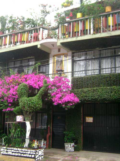 En la pared cubierta de monedita, al pie de la puerta de entrada, se recarga un vetusto y torcido tronco de buganvilia que libra la cornisa buscando luz y extiende sus numerosas ramas hacia el centro de la banqueta donde se entrelaza con otra buganvilia que viene de una jardinera formando un arco alto, fresco, cubierto con flores color fucsia.