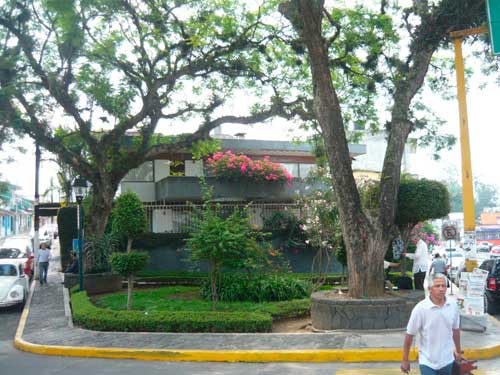 La de hoy, es una Fachada Ganadora de nuestro concurso que da muestras del cuidado de plantas y flores de la familia y el ayuntamiento. Las jardineras de piedra en redondel buscan proteger el tronco de los árboles y a la vez crear un cómodo descanso para caminantes y paseadores. Desde el frente de esa “cuchilla” montada en el balcón de lo que se aprecia como segunda planta, se extiende generosa una buganvilla de encendido coral que por el lado de Hidalgo se repite en color rosa y en ese mismo color las copas de oro y también en amarillo. Se destacan níveas rosas, grandes piñanonas, helechos palmas areca y cargados de fruta el naranjo y el limón. Al frente y del lado de Jiménez se yerguen las palmas y los helechos, se multiplica como dinero la monedita y se reproducen abundantes los arrayanes, guarneques, ficus, truenos y centellas... no perdón... ¡Camelias!