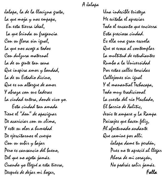 En magnífica letra manuscrita, simétrica, artística y en desuso el día de hoy -salvo algunas excepciones- leemos “A Jalapa” de Doña Falla la tlacotalpeña, la xalapeña, prototipo de la más alta expresión de hospitalidad veracruzana. Jalapa lo escribe así, con “J” de “Jamás podrás salir de mi corazón” como termina estos versos, parte de su legado poético que la pinta de cuerpo entero, de intelecto...y de espíritu.