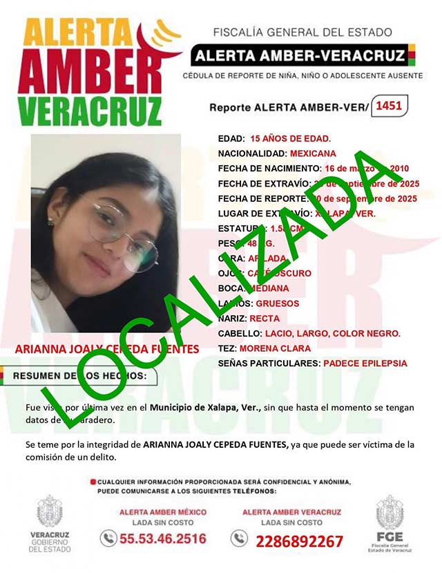 El programa Alerta Amber Veracruz, agradece su colaboración e informa la desactivación de la ALERTA AMBER- VERACRUZ 1451 por la adolescente Arianna Joaly Cepeda Fuentes de 15 años de edad