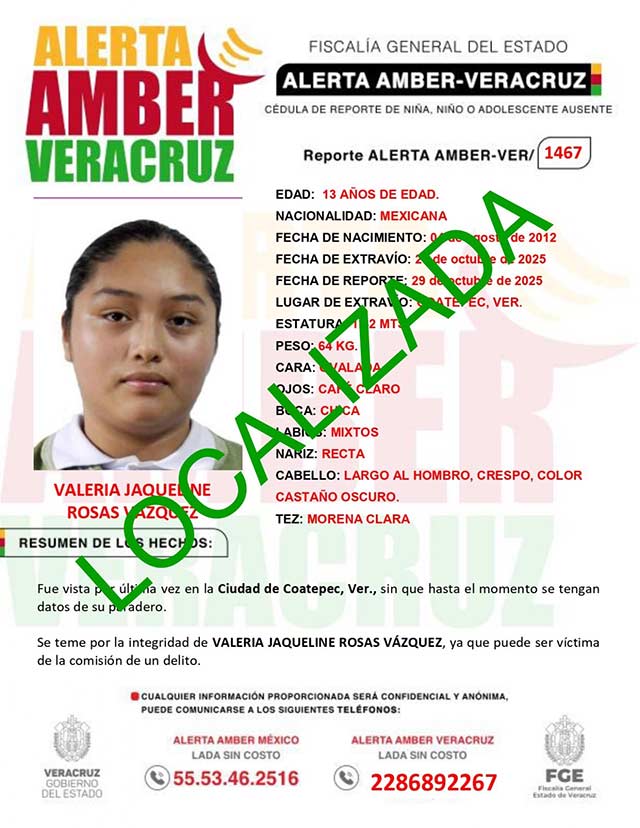 El programa Alerta Amber Veracruz, agradece su colaboración e informa la desactivación de la ALERTA AMBER- VERACRUZ 1467 por la adolescente Valeria Jaqueline Rosas Vázquez de 13 años de edad