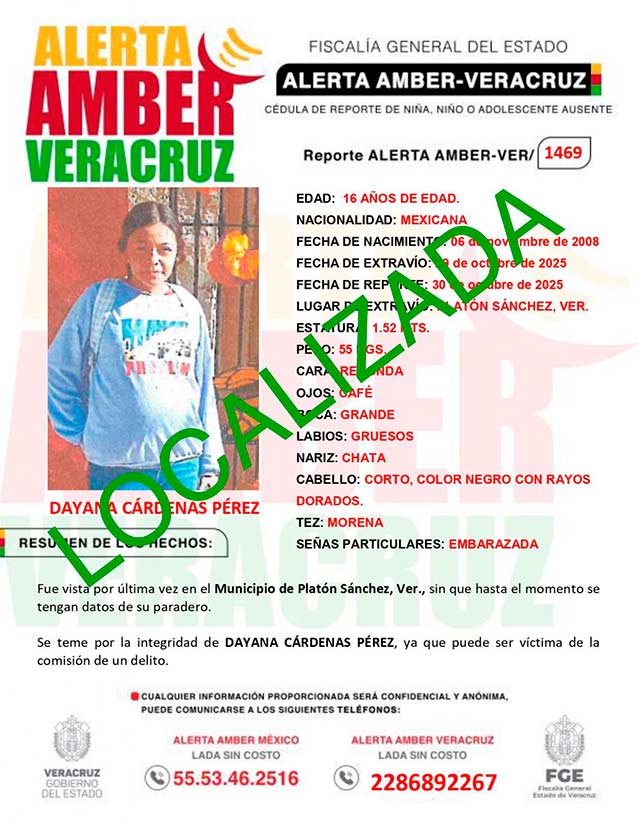 El programa Alerta Amber Veracruz, agradece su colaboración e informa la desactivación de la ALERTA AMBER- VERACRUZ 1469 por la adolescente Dayana Cárdenas Pérez de 16 años de edad