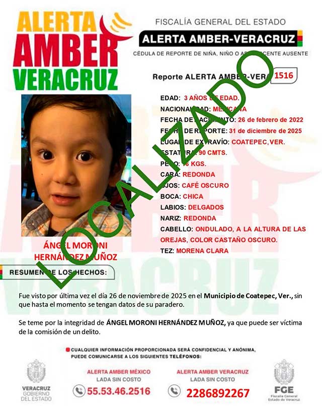 El programa Alerta Amber Veracruz, agradece su colaboración e informa la desactivación de la ALERTA AMBER- VERACRUZ 1516 por el niño Ángel Moroni Hernández Muñoz de 3 años de edad