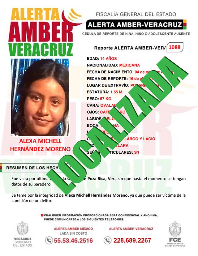 La Coordinación Estatal del Programa AAMBER-VER, informa la desactivación de la Alerta Amber 1088 por la adolescente Alexa Michell Hernández Moreno de 14 años de edad.