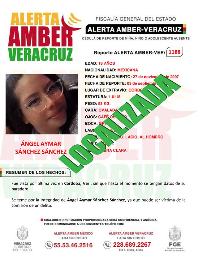 La Coordinación Estatal del Programa AAMBER-VER, informa la desactivación de la Alerta Amber 1188 por la adolescente Ángel Aymar Sánchez Sánchez