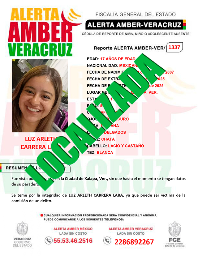 El programa Alerta Amber Veracruz, solicita su colaboración para la desactivación de la ALERTA AMBER- VERACRUZ 1337 por la adolescente Luz Arleth Carrera Lara de 17 años de edad.