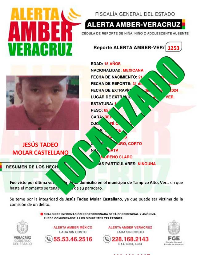 El programa Alerta Amber Veracruz, solicita su colaboración para la desactivación de la ALERTA AMBER- VERACRUZ 1253 por el adolescente Jesús Tadeo Molar Castellano de 15 años de edad