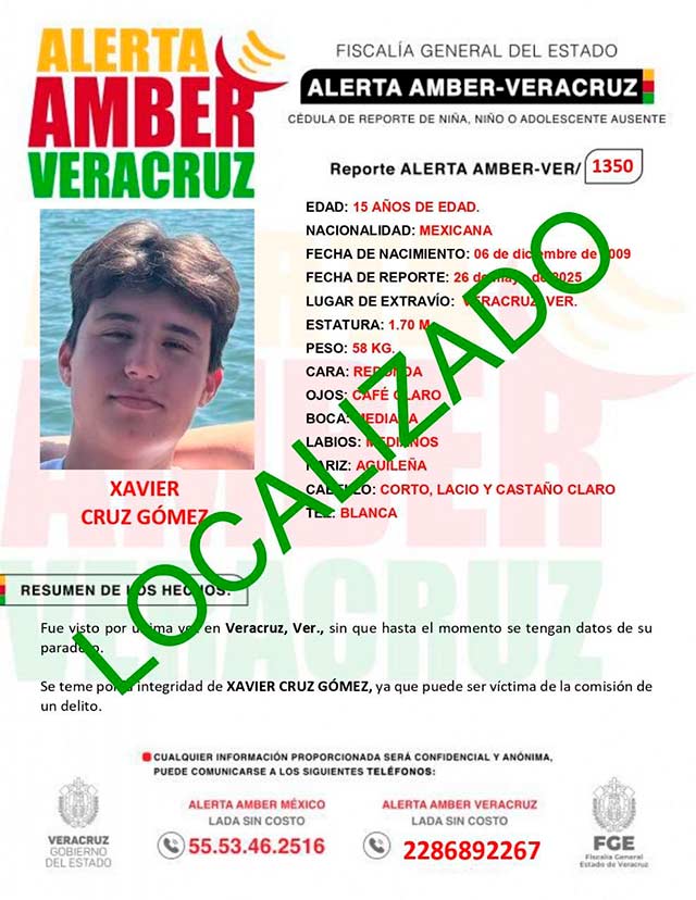 El programa Alerta Amber Veracruz, solicita su colaboración para la desactivación de la ALERTA AMBER- VERACRUZ 1350 por el adolescente Xavier Cruz Gómez de 15 años de edad