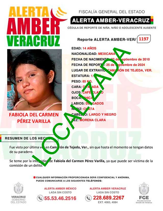 El programa Alerta Amber Veracruz, agradece su colaboración e informa la DESACTIVACIÓN de la ALERTA AMBER- VERACRUZ 1197 por la adolescente FABIOLA DEL CARMEN PÉREZ VARILLA, de 14 años de edad.