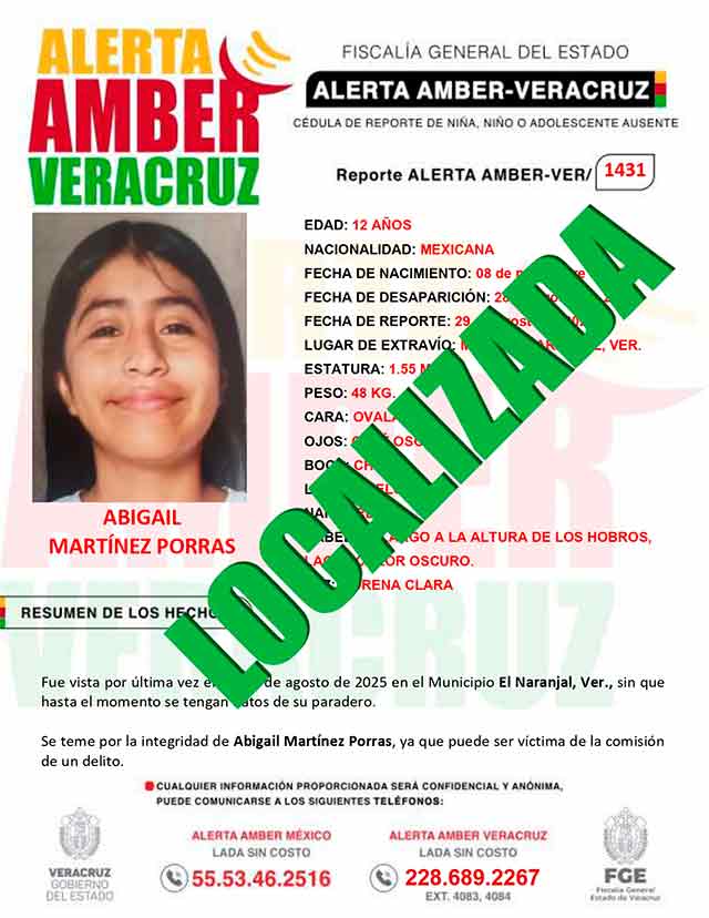 El programa Alerta Amber Veracruz, agradece su colaboración e informa la DESACTIVACIÓN de la ALERTA AMBER- VERACRUZ 1431 por el adolescente Abigail Martínez Porras de 12 años de edad.