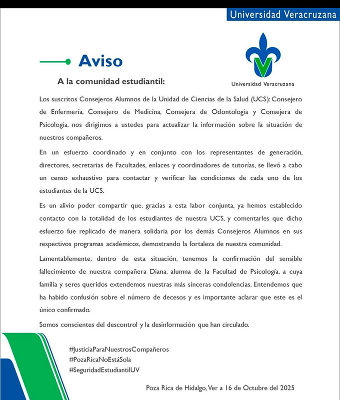 Los consejeros Alumnos de la Unidad de Ciencias de la Salud (UCS) en la Región Poza Rica-Tuxpan de la Universidad Veracruzana informaron que ya se logró contactar a la totalidad de los estudiantes de esa unidad académica y confirmaron el fallecimiento de una alumna de Psicología, descartando que existan jóvenes “desaparecidos”.