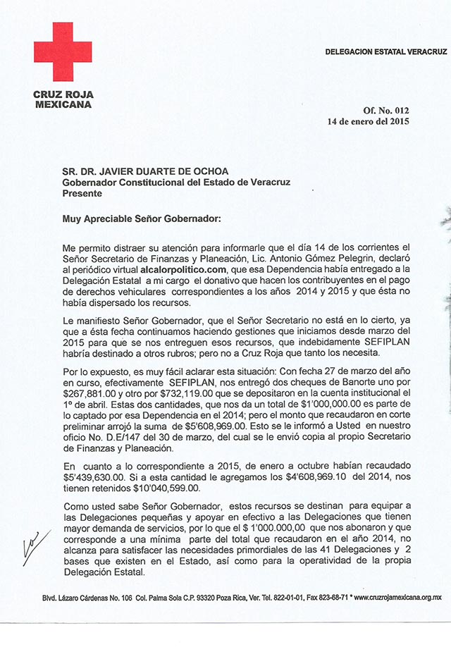 El documento está fechado en el 2015 seguramente por un error del remitente, pero fue recibido este jueves 14 de enero de 2016.