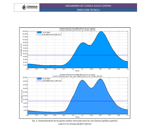 En nuestra región, el período más notorio de estiaje es de febrero a mayo, siendo los meses de abril y mayo lo más críticos de esta temporada cuando adicionalmente a esto se presentan las temperaturas más altas; sin embargo, mayo puede ser aún más significativo, cuando las precipitaciones se prolongan hasta el mes de junio, de lo contrario, el mes más crítico llega a ser abril. En estos meses es cuando la mayoría de los ríos alcanzan sus niveles mínimos. Tal situación se hace más notoria en los afluentes de menor caudal, como lo son los ríos que cruzan por el Norte y Centro del estado de Veracruz.