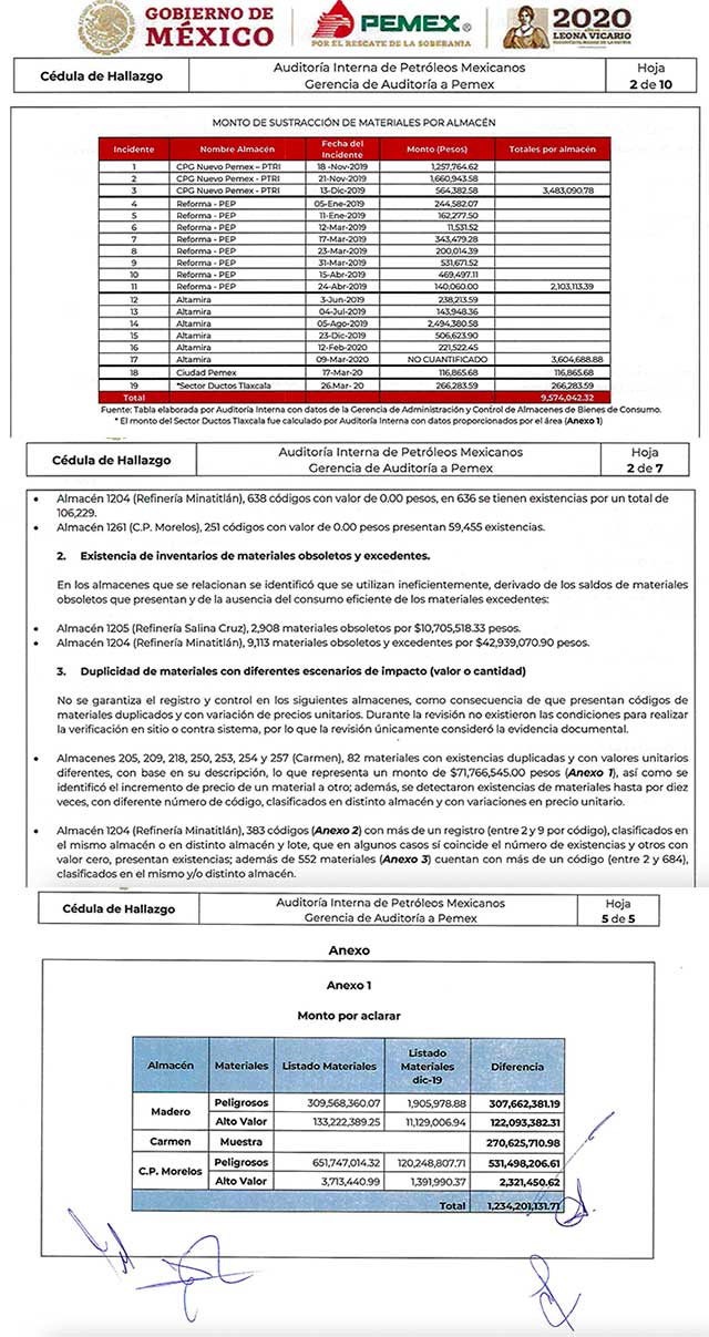 Otro de los hallazgos de la auditoría alertó de “sustracciones en las bodegas del Complejo Procesador de Gas de Nuevo PEMEX, así como en PEMEX PEP Reforma, Altamira, Ciudad PEMEX y el Sector Ductos Tlaxcala.