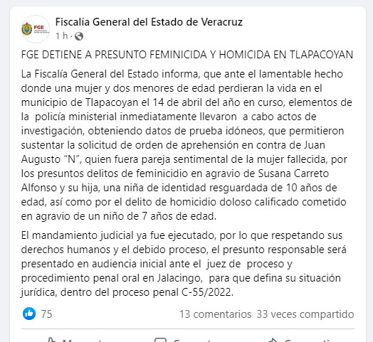 La Fiscalía General del Estado informa, que ante el lamentable hecho donde una mujer y dos menores de edad perdieran la vida en el municipio de Tlapacoyan el 14 de abril del año en curso, elementos de la policía ministerial inmediatamente llevaron a cabo actos de investigación, obteniendo datos de prueba idóneos, que permitieron sustentar la solicitud de orden de aprehensión en contra de Juan Augusto “N”, quien fuera pareja sentimental de la mujer fallecida, por los presuntos delitos de feminicidio en agravio de Susana Carreto Alfonso y su hija, una niña de identidad resguardada de 10 años de edad, así como por el delito de homicidio doloso calificado cometido en agravio de un niño de 7 años de edad.