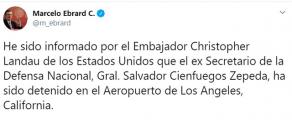 En un tuit, Ebrard dijo que el embajador de Estados Unidos en México, Christopher Landau, le informó de la detención de Cienfuegos, quien fuera secretario de Defensa en el gobierno de Enrique Peña Nieto.