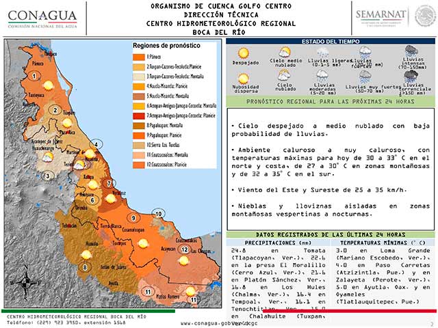 La circulación de un sistema de alta presión que alcanza el Golfo de México, provoca la entrada de aire marítimo tropical hacia la vertiente oriental del país, misma que a su vez favorece esta mañana en la región, condiciones de cielo despejado a medio nublado, viento del Este y Sureste de 20 a 30 km/h y un ambiente templado a cálido.