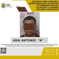 La Fiscalía General del Estado informa que, elementos de la Policía Ministerial en coordinación con Fuerzas Federales y estatales, cumplimentaron una orden de aprehensión en la localidad Villa Alta, perteneciente al municipio de Texistepec, emitida por un juez de control con sede en este distrito, en contra de Asai Antonio “N” como probable responsable de los delitos de homicidio doloso calificado cometido en agravio de las víctimas identificadas con las iniciales Y. L. G., A. N. R., M. A. N. L., S. M. D., y M. N. A., y lesiones dolosas calificadas cometido en agravio de las víctimas identificadas con las iniciales A. T. Q., y B. E. M. F.