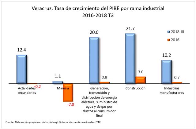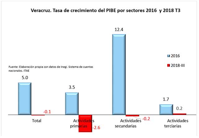 La Economía veracruzana registró un crecimiento del 5% durante el tercer trimestre de 2018, lo cual contrasta con el pobre desempeño observado en 2016 cuando el PIBE decreció -0.1%.