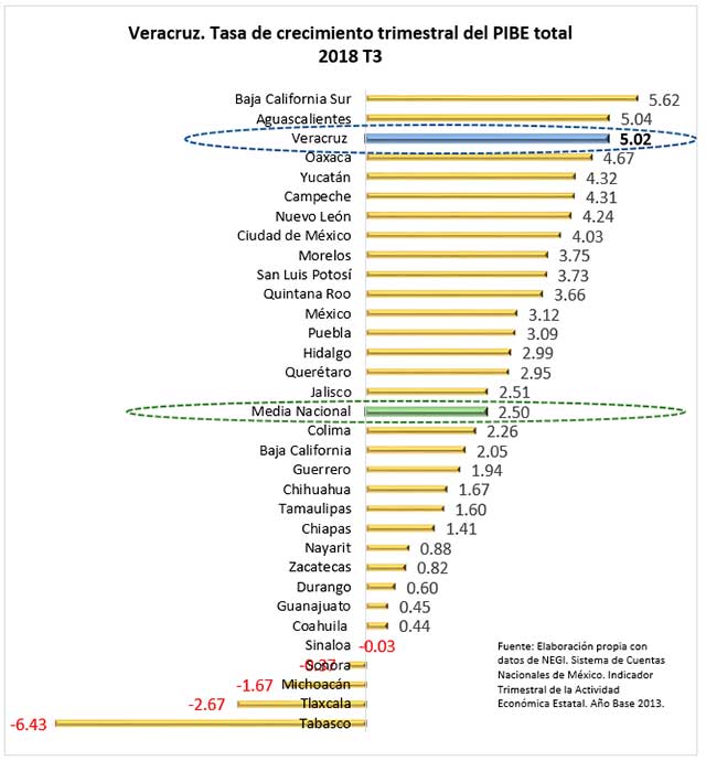 Este comportamiento ubica a Veracruz en el tercer lugar entre los estados de mayor crecimiento en ese período, sólo superado por Baja California Sur que creció 5.62% y Aguascalientes que creció 5.04%.
