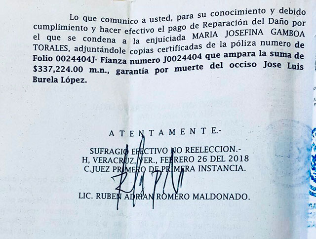 Gamboa Torales argumentó que el documento no puede estar en manos de un particular que no es un tercero interesado, subrayando que el monto señalado quedó depositado en el Juzgado después del accidente automovilístico.