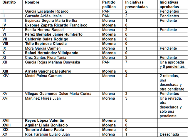 Los 9 diputados de MORENA que no han presentado una iniciativa de ley de manera individual, Rafael Hernández Villalpando, Ricardo Exome Zapata, Humberto Pérez Bernabé, Rodrigo Calderón Salas, Claudia Tello Espinosa, Eleuterio Arrieta Sanchez, Valentín Reyes López, Bonifacio Aguilar Linda y Paola Tenorio Adame, se han ocultado bajo las iniciativas “De Grupo”, mismo que en un año ha propuesto únicamente 15 iniciativas.