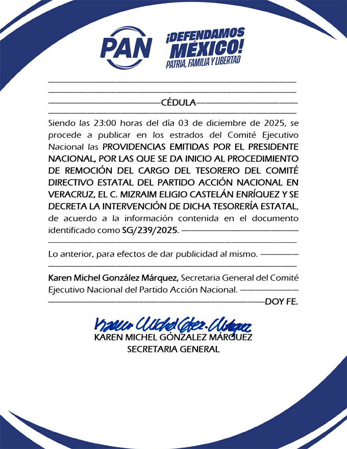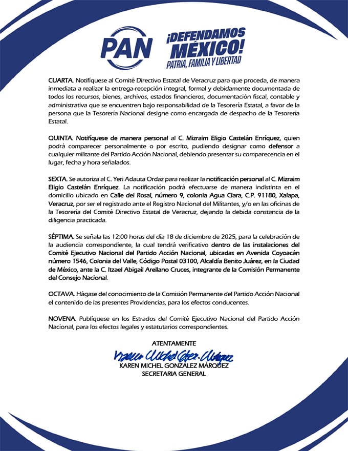 - Notificar personalmente al tesorero y citarlo a audiencia el 18 de diciembre de 2025 en la sede nacional del PAN.