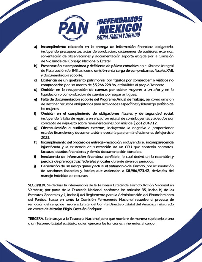 Tras la revisión de los antecedentes, el CEN determinó que las conductas acreditadas actualizan los supuestos para iniciar la remoción del tesorero, así como intervenir la Tesorería Estatal de Veracruz hasta por seis meses, con fundamento en los Estatutos Generales y en el Reglamento para la Administración del Financiamiento del Partido.