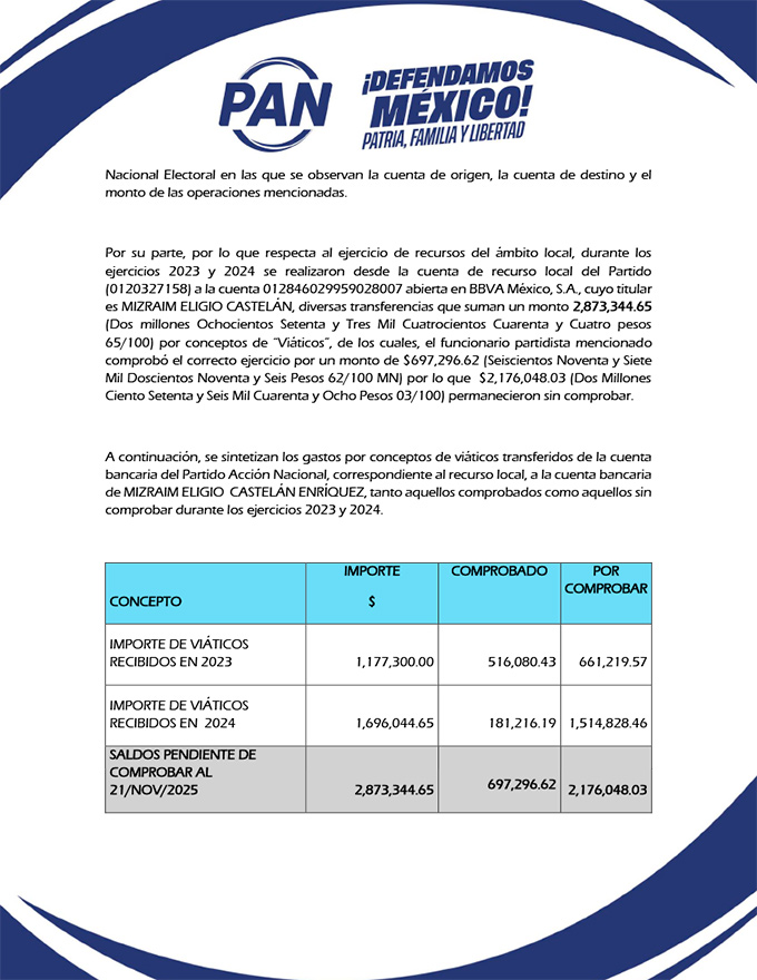 El documento también detalla que, entre 2023 y 2024, se realizaron transferencias desde la cuenta del partido hacia la cuenta personal del tesorero por un total de 2,873,344.65 pesos. De esta cifra únicamente 697,296.62 fueron comprobados, lo que dejó pendientes más de 2.1 millones de pesos. En los anexos se incluyen pólizas, archivos y bases de datos que acreditan estos movimientos.