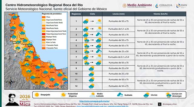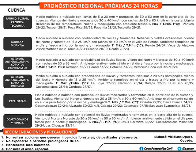 El Frente Frío 45 se analiza desde el noreste de los Estados Unidos hasta un centro de baja presión en el noroeste del Golfo de México, y continúa sobre el noreste del país. El sistema tenderá a estacionarse e interaccionará con una vaguada cuyo eje se localizará sobre el oeste y suroeste del Golfo. Por lo anterior, se esperan lluvias moderadas a fuertes y tormentas aisladas, con acumulados de 5 a 20 mm en promedio en el estado y máximos de 30 a 50 mm en las partes altas-medias de las cuencas del Pánuco al Tecolutla, cuencas del Nautla al Colipa, región montañosa central y entre las cuencas del Papaloapan al Tonalá, incluyendo los Tuxtlas, sin descartar valores mayores de forma puntual. Viento del Noroeste y Norte de 30 a 40 km/h con rachas de 50 a 65 km/h en la costa. Disminuyen las temperaturas máximas y se mantiene ambiente templado a fresco por la noche y madrugada. Oleaje de 1.0 a 2.0 metros cerca de la costa.