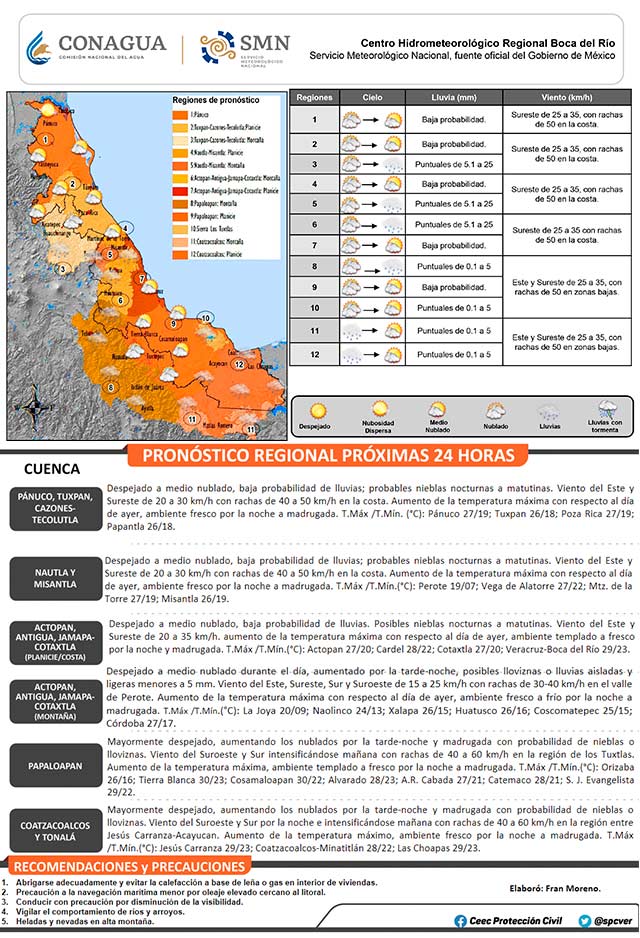 A partir de esta noche se podría presentar una surada pero especialmente mañana viernes cuando es probable que alcance rachas de 40 a 60 kilómetros por hora en la costa norte, regiones del Valle de Perote, Orizaba, Los Tuxtlas y entre Jesús Carranza-Acayucan.