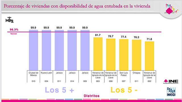 El Distrito de Papantla (06) reportó que un 78.7 por ciento de la población cuenta con agua en sus viviendas, y por último Tuxpan (03) con 81.7 por ciento.