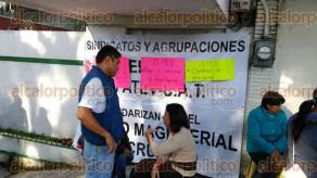 Docentes del Sindicato Magisterial Veracruzano (SMV) cerraron las oficinas de la Subdirección de Escuelas Secundarias Estatales, en la avenida Orizaba, en exigencia de la destitución del titular de dicha dependencia, José Luis Contreras, ante el incumplimiento de acuerdos con la organización, explicó el secretario general, José Luis Valdeolivar Díaz.