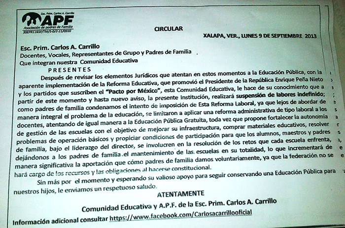 Nuevamente hago manifestación de que en la primaria “Carlos A. Carrillo” están haciendo uso indebido de la manifestación de los padres de familia, según la circular que emiten de fecha 9 de septiembre de 2013, hacen mención de los vocales, representantes de grupo y padres de familia estamos de acuerdo y apoyamos la lucha de los “maestros”; si obligándonos a firmar un documento quiere decir que los estamos apoyando, están mal, lo firmamos porque no queremos que tomen represalias contra nuestros hijos, se manifiestan diciendo que nosotros deberemos de realizar todos los pagos correspondientes con la escuela, cuando inicialmente y realmente lo único que les importa es que no les quiten sus 90 días de aguinaldo, que les quiten días de vacaciones, que tienen muchos, y que no puedan heredar sus plazas para sus hijos o familiares.